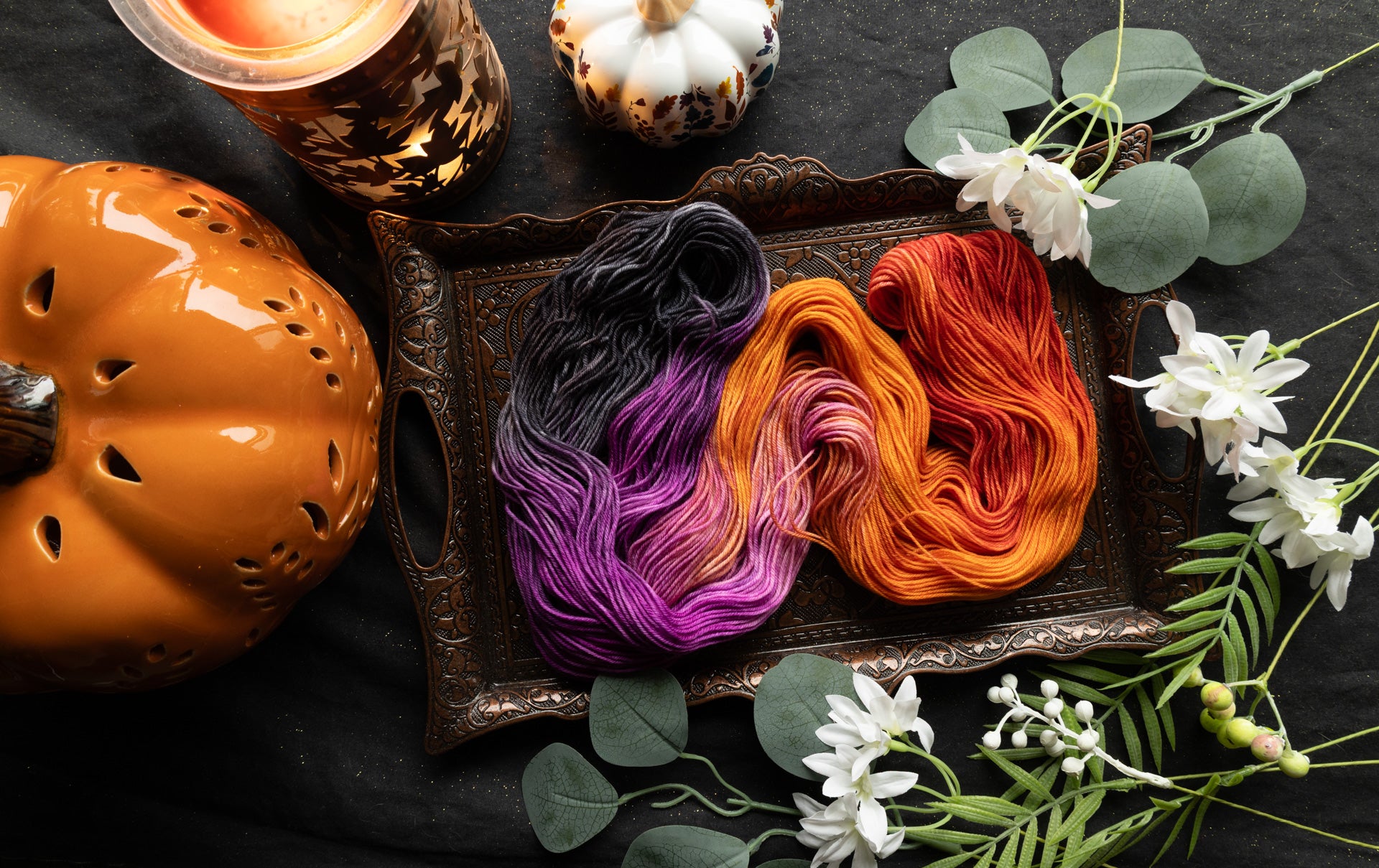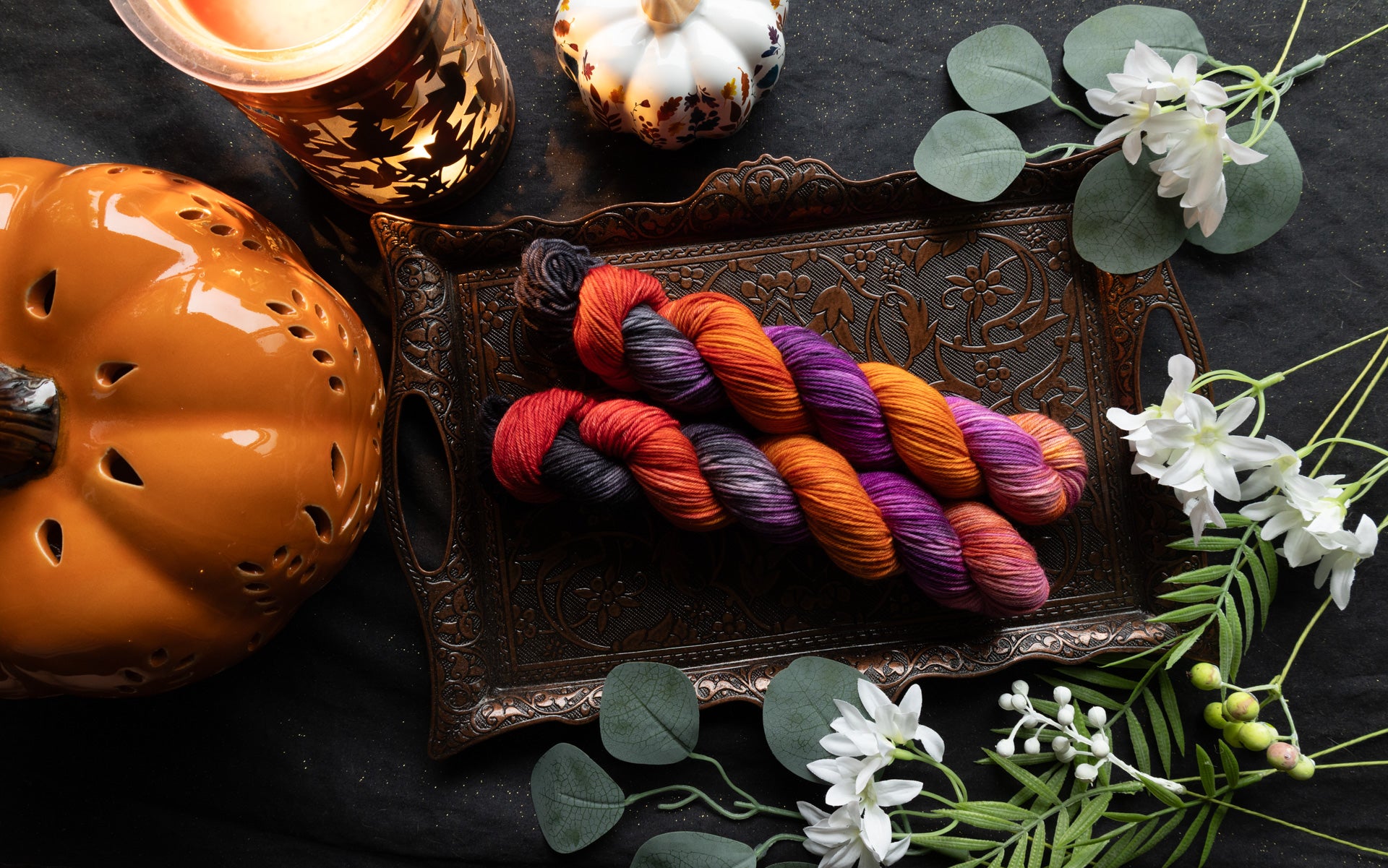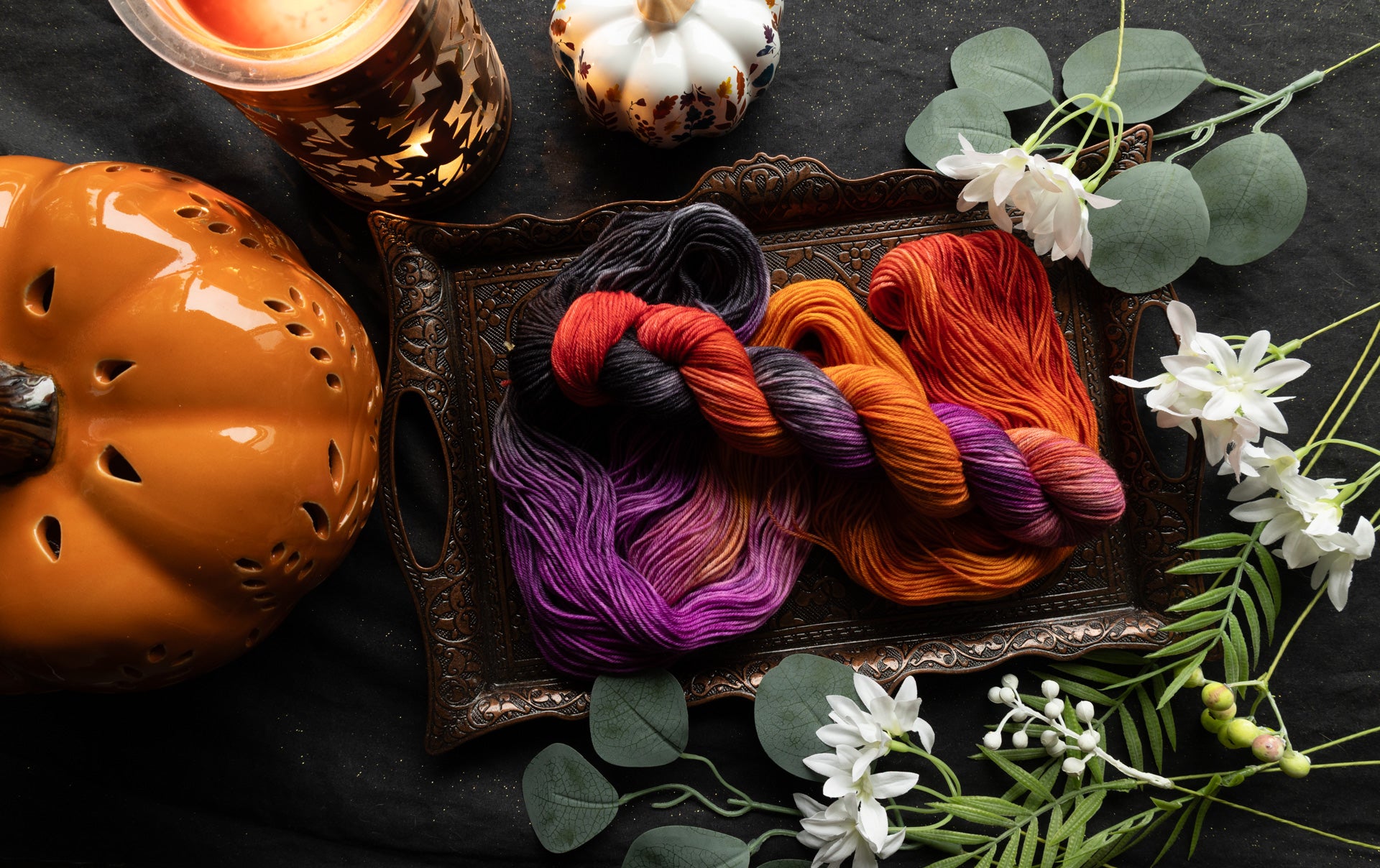 Rust red, burnt orange, deep plum, and smoky black swirl together in this moody blend. Inspired by the glowing harvest moon and the magic it stirs.
