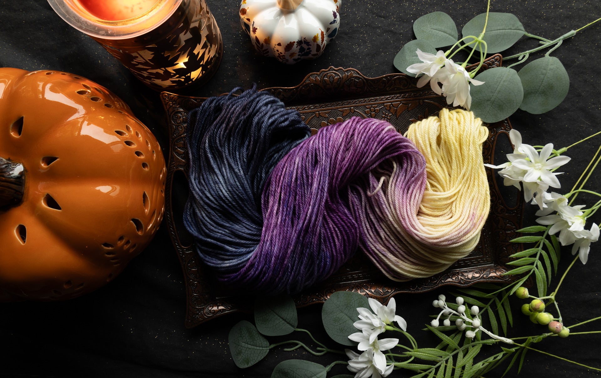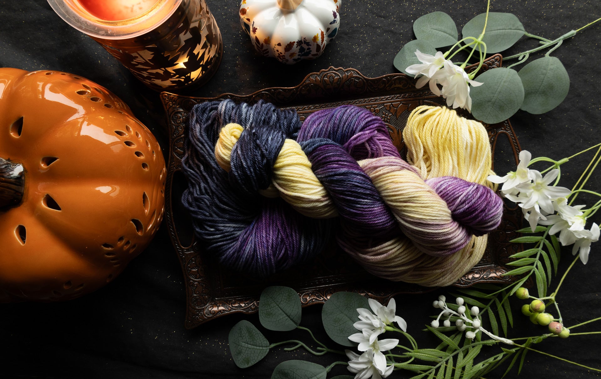 Like moonlight spilling across a velvet sky, this colorway glows with soft cream, deep plum, and shadowy midnight blue. Mysterious and serene, it captures the quiet magic of a clear autumn night.