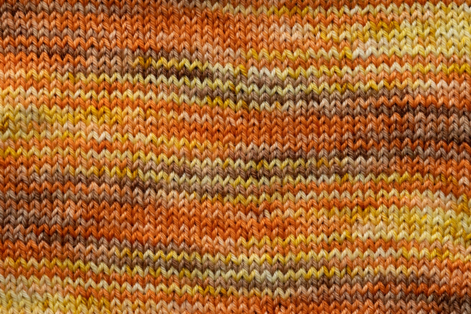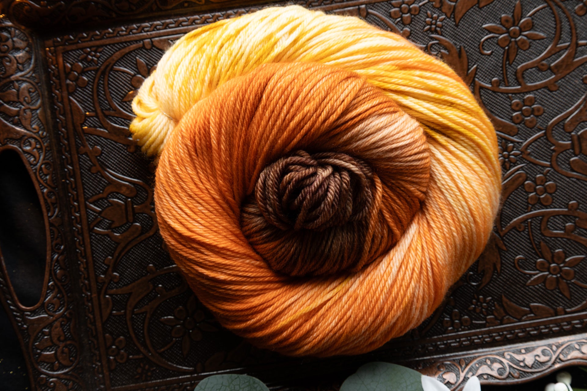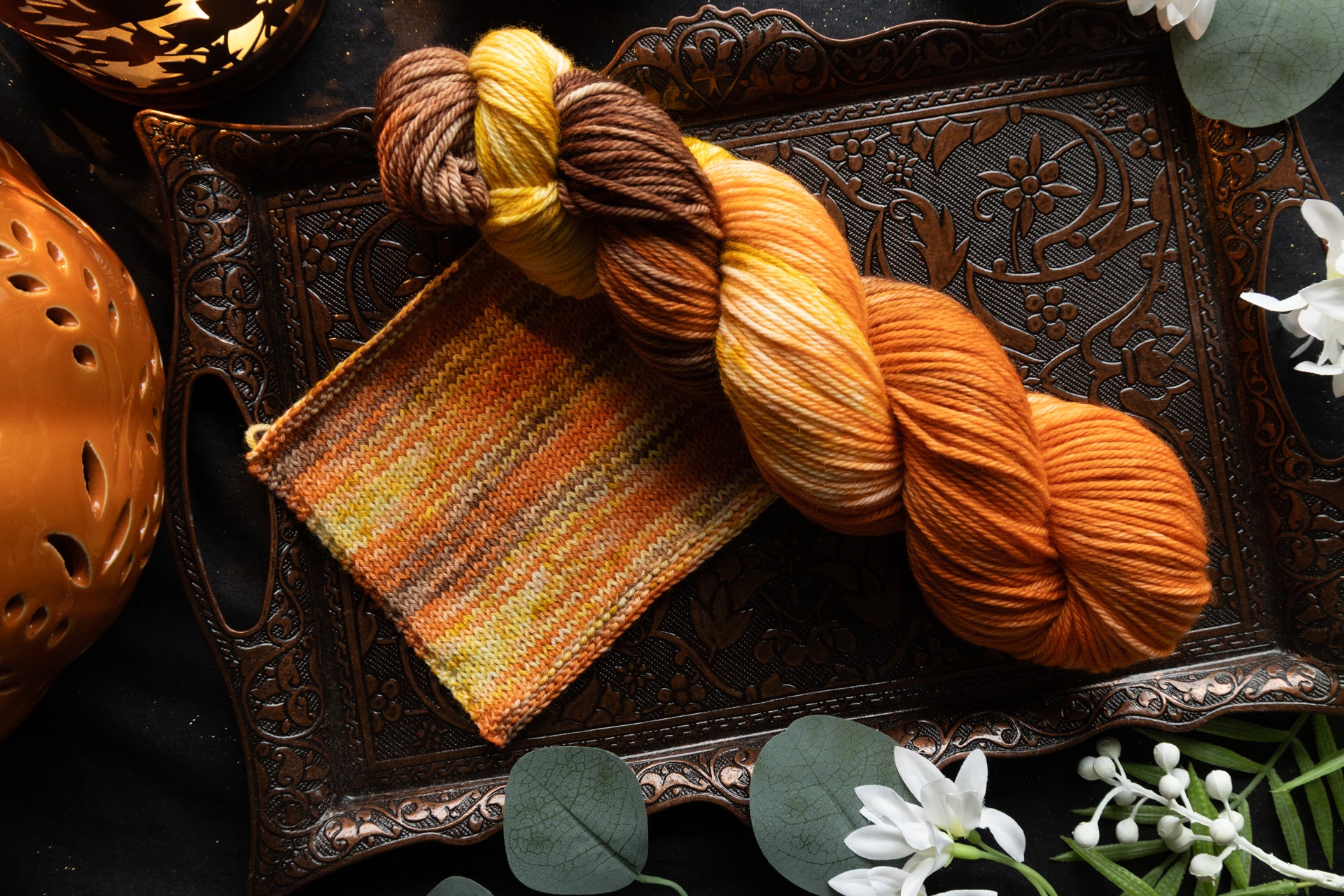 Rich pumpkin orange, cinnamon brown, cream, and golden flecks. Warm and inviting, this blend is pure autumn comfort in a skein.